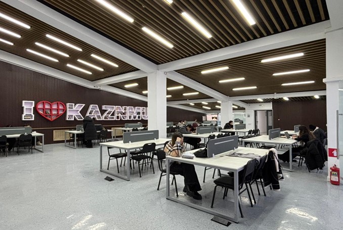 The coworking area can accommodate 80–100 students at the same time, ensuring sufficient seating even during peak hours. The space includes self-service stations equipped with all-in-one computers, through which students can access digital educational resources, complete academic assignments, work with email, learning management systems, and other online services.